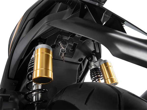 Phuộc nhún lò xo được trang bị bình dầu thủy lực giúp xe ổn định ở mọi vận tốc di chuyển.