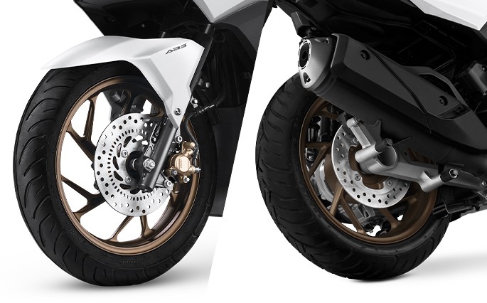 Với hệ thống ABS phía trước với phanh đĩa trước và sau giúp bánh xe không bị bó cứng khi phanh gấp. Tự tin điều khiển và dừng xe trong mọi tình huống. Lốp trước-lốp sau lớn hơn, giúp bám đường tốt hơn, tự tin hơn khi lái.